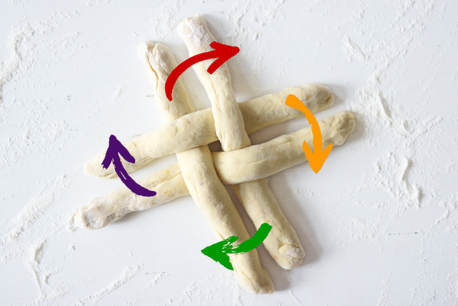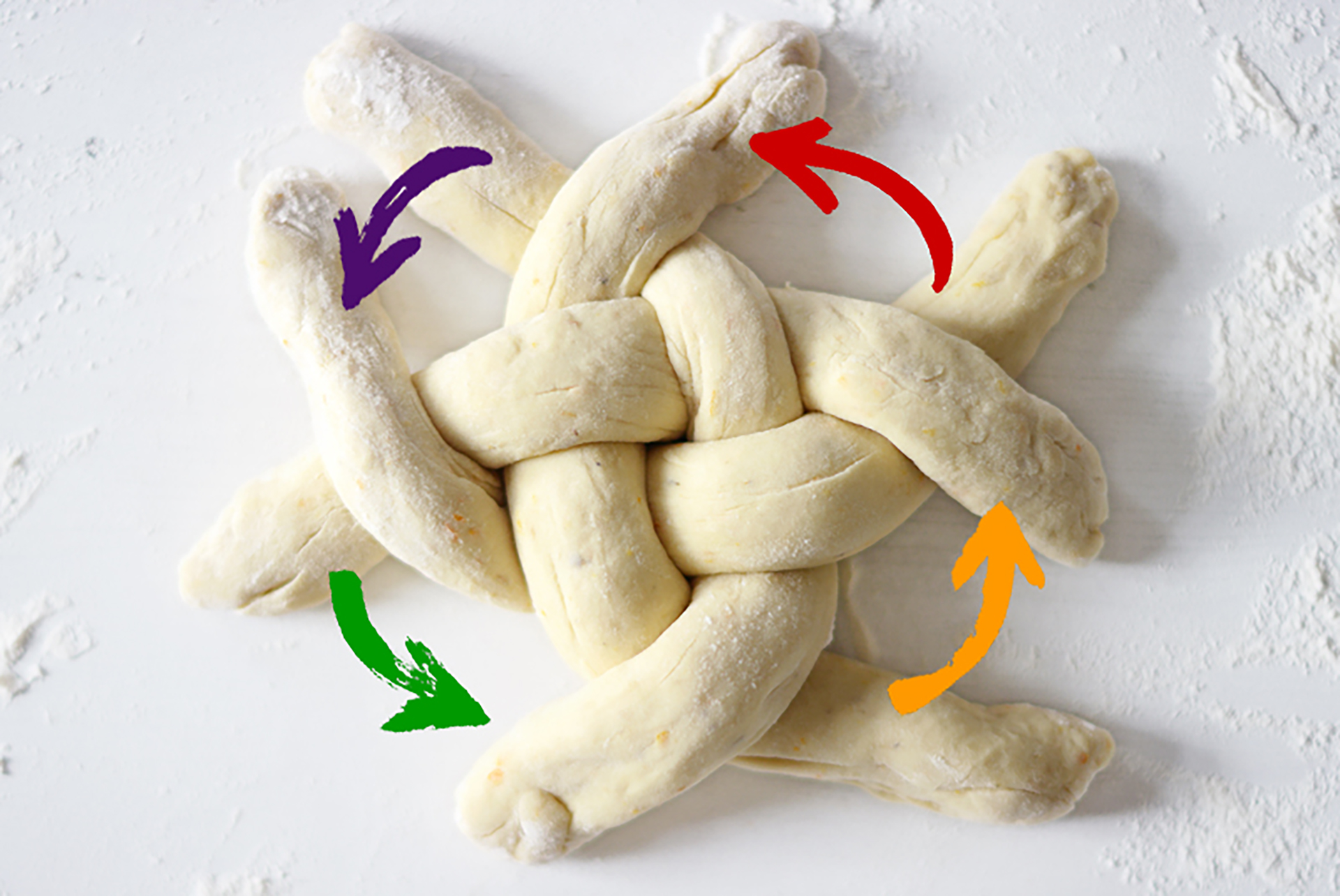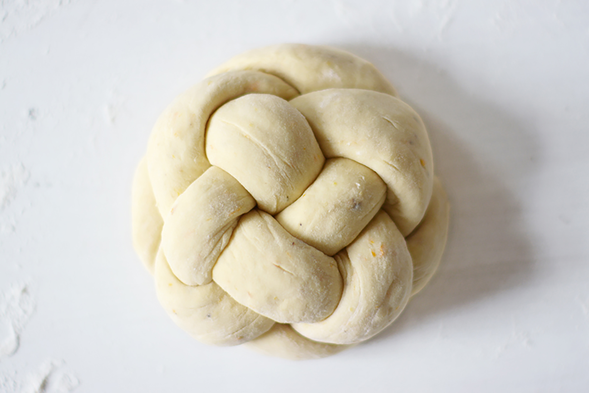 Den Teig in vier gleich große Teile teilen (bzw. acht Teile, falls man zwei kleine Zöpfe macht) und zu Rollen formen. Die Teigrollen kreuzförmig anordnen und den jeweils unten liegenden Teigstrang über den nächsten legen. Im nächsten Schritt erneut den unten liegenden Strang über den nächsten legen, allerdings in die entgegengesetzte Richtung. So weitermachen bis die Rollen zu kurz dafür werden. Anschließend die Enden unter den Laib schieben. Den Hefezopf nun für 30 weitere Minuten gehen lassen.